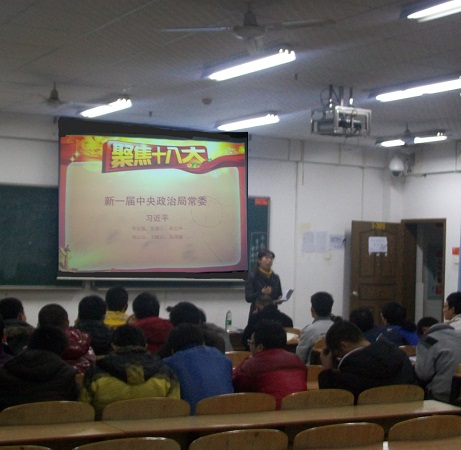 为了庆祝党的十八大胜利召开,学习和贯彻党的方针政策,鼓励大家积极向党组织靠拢,12月5日晚八点核资源工程学院矿资101班于1教309教室召开了“学习贯彻党的十八大精神”的主题班会,本次会议受南华大学校团委委托由矿资101班举办,出席本次会议的有学工室郑宇老师、矿资101班班主任杨月平老师、院学生会主席吕亚洲,矿资101班全体学生。 首先,吕亚洲带领大家重温了十八大报告的主要内容。随后,郑宇老师发表了重要讲话,他重申了十八大精神的重要性,希望大家深入了解党的十八大精神,希望大家发扬矿资101班团结向上的精神,用实际行动来贯彻党的十八大精神,迎接即将到来的期末考试,严肃考风考纪 。 学院以本次会议为契机,让同学们了解到社会主义建设的道路任重而道远,明确了自己作为一名大学生的使命与责任,从而以更加积极地姿态投入到学习生活中去。