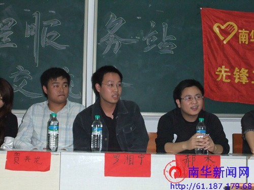 在主持人精彩的开场以及大家热烈的掌声中,会议正式拉开了帷幕。首先,由参加本次会议的嘉宾向新队员介绍经验。总队队长贺新龙对先锋服务站的工作给予了高度评价,并表达了对先锋的良好期望。每一位先锋工程服务站的前辈都竭尽所能地将自己在大学生活中所得到的体会都告诉新队员。他们的经验之谈博得了全场同学的热烈欢迎,其中最令人受益匪浅的是前任站长罗湘宁和奥运志愿者郝杰的讲话,他们都提到了大学生活的合理规划问题,郝杰还提到他的十个“一”,让新生们从刚进入大学的迷茫中走出来,开始思考自己的大学目标。他们的讲话不仅幽默,而且深刻,同时更体现了他们作为一名青年志愿者的热情与爱心。