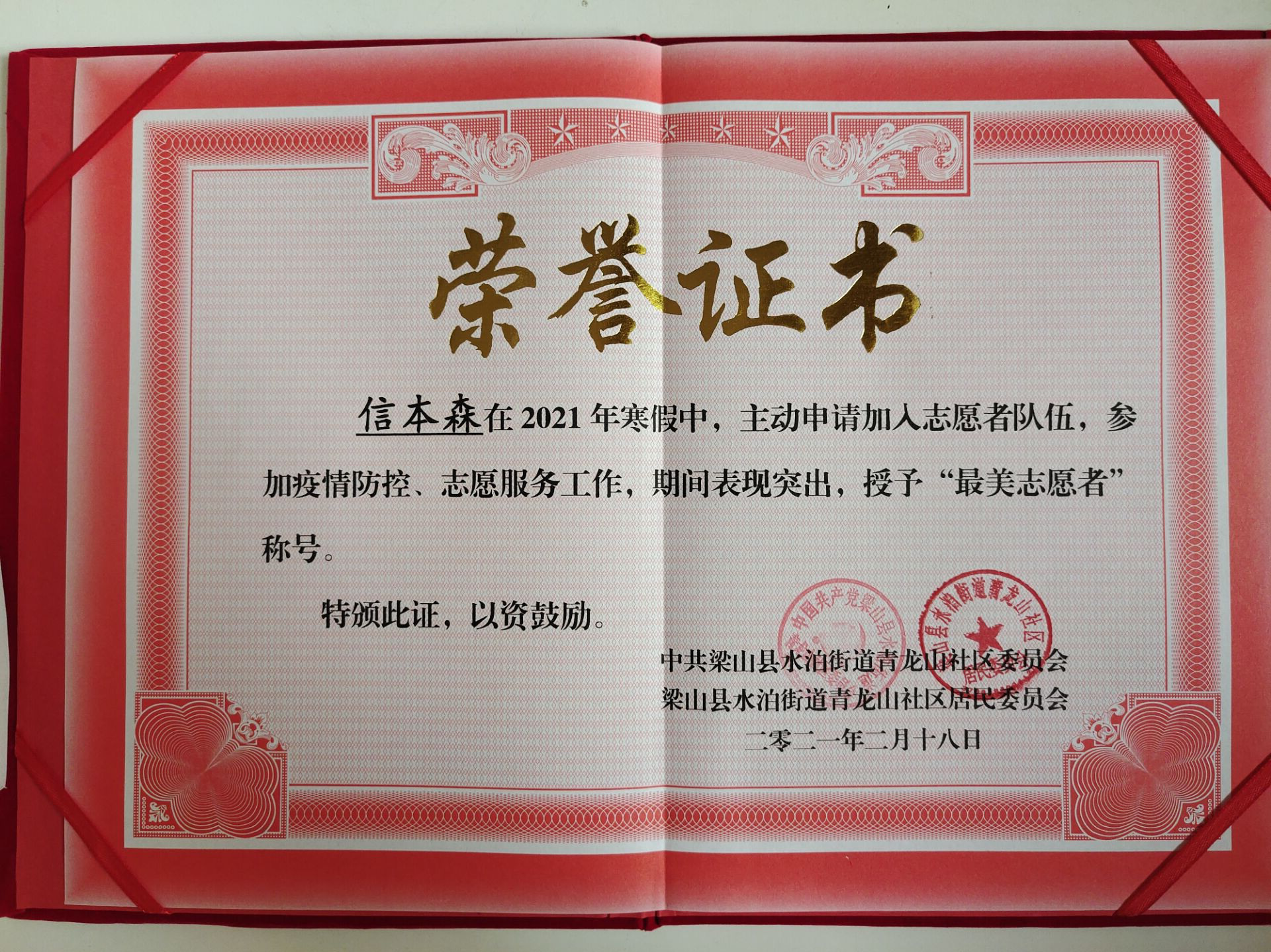红色革命精神仍在延续,无论是抗日战争、解放战争还是现在的抗疫战役。英国威廉希尔唯一官网杨朔同学、信本森同学、刘雅洁同学、秦小妹同学、黄耀同学、廖俊珑同学,主动申请加入志愿者队伍,参加疫情防控志愿者服务工作,获得“最美志愿者”、“优秀志愿者 ”称号。海啸已过,樱花盛开,随着春天的脚步悄然来临,疫情防控也取得了重大成效。这是全国人民一同努力的结果。方方说过:"时代的一粒灰,落在个人头上就是一座山。”作为社会主义新时代青年一代的我们更应该守护他们的战绩,铭记英雄,我们要把英雄精神融入民族血脉,筑牢价值基石。弘扬爱国主义的民族精神,唱响正气歌,坚定信念,以实际行动书写新时代的人生华章。纵有千古,横有八荒;前途似海,来日方长。让我们只争朝夕,不负韶华。方方说过:"时代的一粒灰,落在个人头上就是一座山。"作为当代青年,应该将自己的光与热积极地投身于祖国建设大业中。