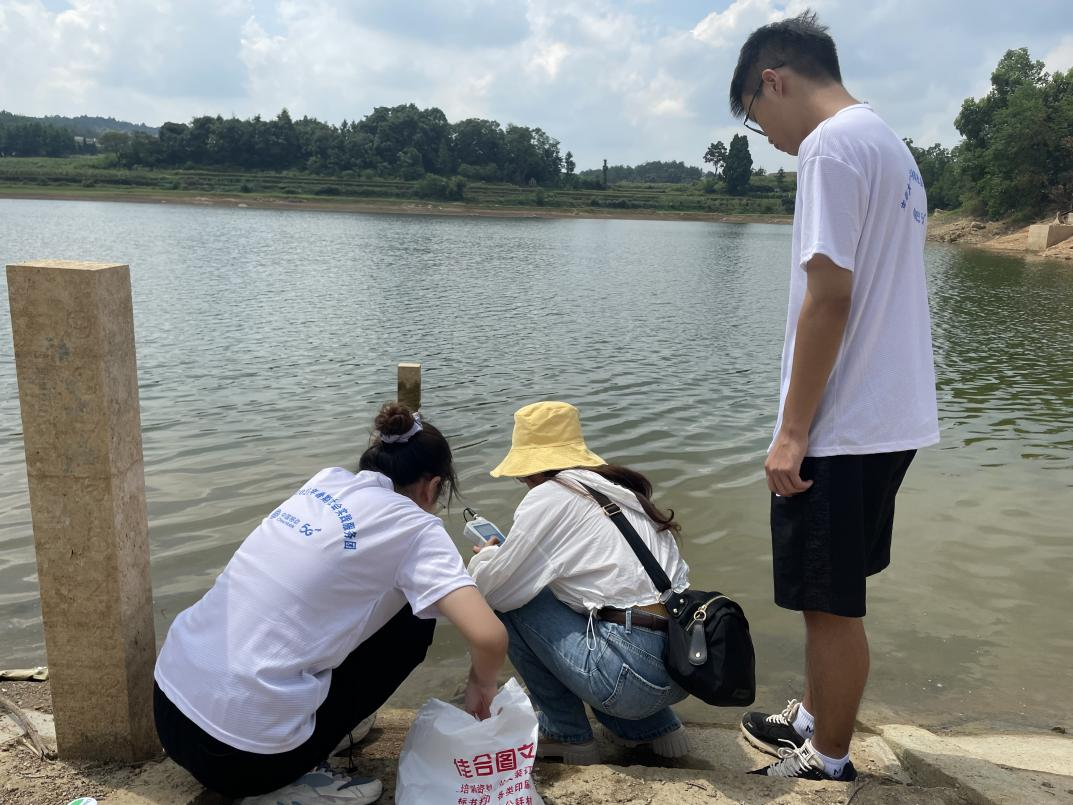 之后,为了更好的了解小水塘村的水质情况,调研团师生前往六个不同的地方采取水样。为了水样的合理性和代表性,分别选取了村民经常用于灌溉的水库的水,农田附近沟渠里的水以及村民平时用来生活的井水等。通过对水样的ph、溶解氧等指标的测定,对比国家指标,查找河流具体的超标物质,来检测水样被污染的情况。