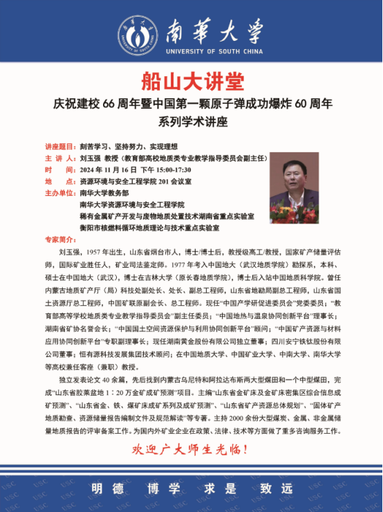 近日,在中国第一颗原子弹成功爆炸60周年和南华大学迎来建校66周年之际,英国威廉希尔唯一官网邀请教育部高校地质类专业教学指导委员会副主任刘玉强教授为学院师生作了题为《不忘初心,努力学习,实现梦想》的主题讲座。讲座由院党委副书记曾志伟主持。