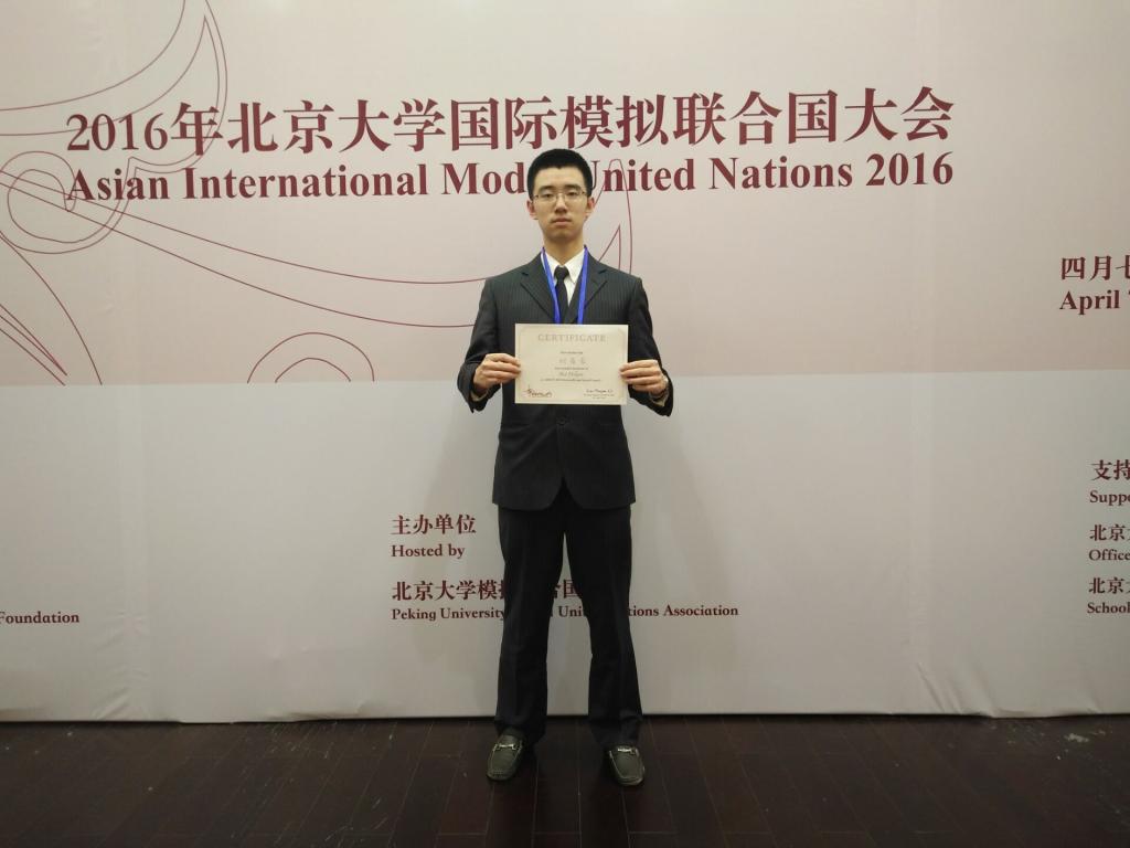 学院纪富豪同学荣获2016年北京大学国际模拟联合国最佳代表称号