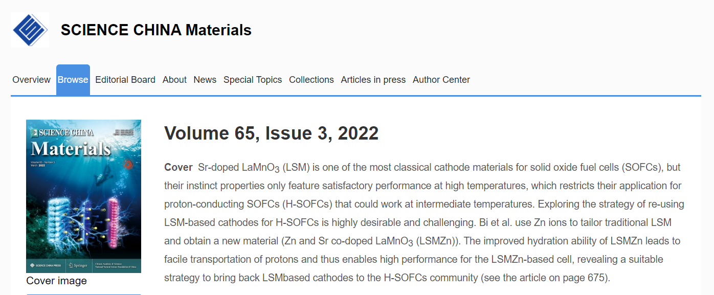 近期,我院毕磊教授团队研究发现,通过Zn元素的掺杂使得第一代Sr-LaMnO3阴极可以在质子导体固体氧化物燃料电池中展现出优异的性能,相关成果发表在2022年3月刊的《中国科学材料》(SCIENCE CHINA Materials)期刊上,以期刊封面论文的形式发表题为“High-performance proton-conducting solid oxide fuel cells using the first-generation Sr-doped LaMnO3cathode tailored with Zn ions”的研究论文,并被《中国科学材料》期刊的官方微信公众号进行推送宣传。这是该团队在质子导体固体氧化物燃料电池材料研究中取得的又一成果。
