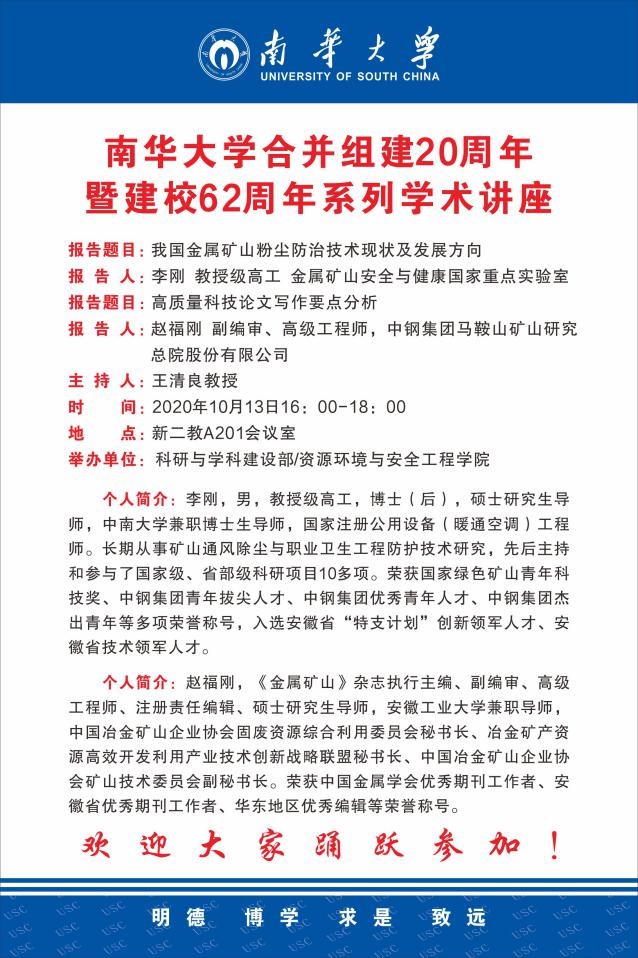 10月13日下午,中钢集团马鞍山矿山研究总院金属矿山安全与健康国家重点实验室李刚教授级高工和《金属矿山》副编审赵福刚高工应邀为我院师生进行了“我国金属矿山粉尘防治技术现状及发展方向”和“高质量科技论文写作要点分析”两场学术讲座。两场讲座是我院为我校合并组建20周年暨建校62周年开展的系列高水平系列学术报告会。报告会由王清良副院长主持,李刚教授级高工向师生详细介绍了国内金属矿山粉尘防治技术的实践与发展,并提出粉尘防治技术能开展的研究方向。赵福刚高工重点介绍了《金属矿山》期刊对稿件审稿的流程和要求,对科研论文写作、投稿等方面进行了详细指导。