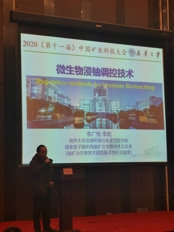 12月10日17时,我院丁德馨教授应邀在大会“院士、专家论坛”上做了题为“铀矿生物浸出的研究进展和发展方向”的主报告。12月11日,大会设置了“岩土工程安全预警技术”“绿色开采与智慧矿山”“矿物加工与综合利用”“环保与生态修复”“矿业青年学术”“煤炭精准开采与清洁加工”等6个平行分论坛,共180余位专家、学者们分享了其在相关领域的最新研究成果。我院贺桂成教授应邀在岩土工程安全预警技术分论坛做了题为“热水力耦合作用下红层边坡软弱夹层力学行为及破坏机理”的报告;李乾副教授应邀在绿色开采与智慧矿山分论坛做了题为“微生物浸铀调控技术”的报告;蒲成志副教授应邀在岩土工程安全预警技术分论坛做了题为“稳定渗透水压加载控制系统研制及应用研究”的报告;朱忠华老师应邀在岩土工程安全预警技术分论坛做了题为“随机介质理论及其在放矿与开采沉陷的应用研究”的报告;康虔老师应邀在环保与生态修复分论坛做了题为“活化锂渣基细粒径全尾砂胶结充填材料特性研究”的报告。除此之外,会议主办方还在B4展位上展出了我院在矿业领域最新的科研成果。