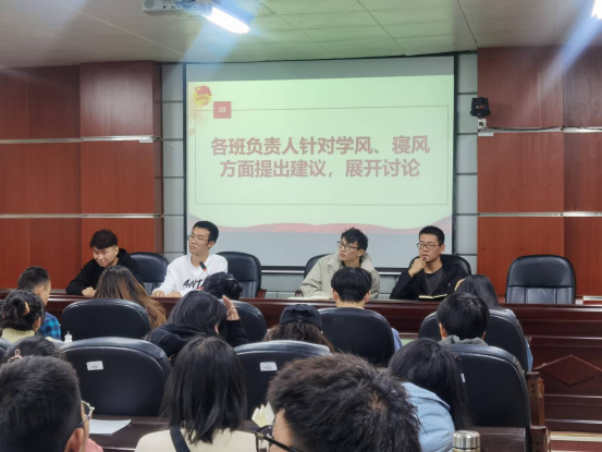 我院师生非常注重学风、寝风的建设,大会第五项追加了就学风、寝风建设相关工作进行了讨论。首先院主席团成员魏宇航同学针对宿管部考核改革、近期工作内容进行了简单概括,随后院宿管部部长王城同学就近期工作及下一阶段工作进行了安排,两位同学的讲话强调了宿管部会针对学生的实际情况进行考核并每周进行各项考核的数据统计。接着院学习部部长郑鑫杨同学对近期学风建设工作进行了安排,提到早晚自习、正常上课的缺勤迟到现象,并提出若有同学缺勤四次及以上,给予学院警告,如缺勤达到8次及以上,将进行全院通报批评的方案。最后各班负责人配合展开讨论,主要围绕“夜不归宿”、“自习或开班会无可用教室”、“违章电器具体分类”、“因特殊原因上课违纪”这几个问题提出疑问,最终问题得到解决,进一步明确了违章电器的类别,并将针对夜不归宿的现象进行严查,当自习无教室可用时联系郑鑫杨同学会帮忙解决。