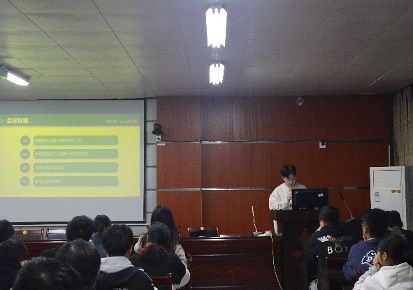 大会第二项,张璇老师做日后宿管工作相关安排。张璇老师从学生宿舍住宿管理规定为基础,从床位安排、校外居住、寝室出入管理、消防安全管理用电安全四个方面详细的介绍了我们应该怎么做。在宿舍安全方面,张璇老师着重讲解了违章违规使用大规模电器的危害,近几年宿舍消防安全尤为重要,各地发生的宿舍火灾事件已经引起了国家关注,所以我们更应该重视。同时,张璇老师也将宿舍日常维修管理、宿舍保修流程再次进行了介绍。此外,张璇老师还强调了在宿舍不允许有聚众非法活动,如:赌博、传教等,如有此类活动,每位学生都应肩负起督促之责,及时上报,营造好的学习生活氛围。