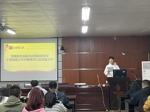 大会第一项,党建委员会副书记陈家辉从两个方面汇报了目前党建各部门工作的开展情况。今年10月,部门招新与面试已圆满完成,下一步将有序开展秋季入党积极分子的培训班活动、完成党员发展对象转预备、举办各学生党支部间的篮球友谊赛、进行新一批党员寝室贴条工作等。