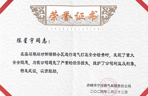 表扬信中,该公司对陈星宇同学的专业能力、敬业精神、工作态度给予了高度评价,陈星宇同学在实习期间,凭借专业知识发现隐患及时反馈,有效避免了燃气泄漏及有可能发生的燃气爆炸事故,极大地避免了严重的经济损失和公司利益及形象。