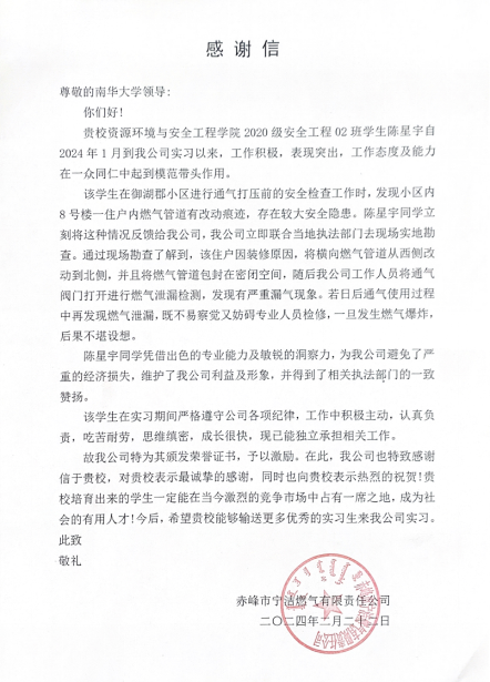 近日,我院收到了来自赤峰市宁洁燃气有限责任公司的感谢信,信中对本2020级安全工程专业陈星宇同学在实习期间进行安全检查时发现了重大安全隐患并及时反馈的行为给予了赞美和表扬。
