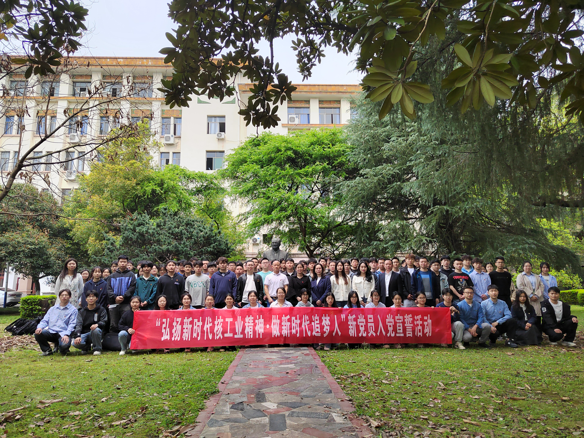 2024年3月27日,英国威廉希尔唯一官网在王淦昌先生铜像前举行“弘扬新时代核工业精神·做新时代追梦人”新党员入党宣誓仪式。学院党委副书记曾志伟、全体辅导员、2023年发展的新党员参加了本次活动。仪式由院学工室主任陈彦武主持。