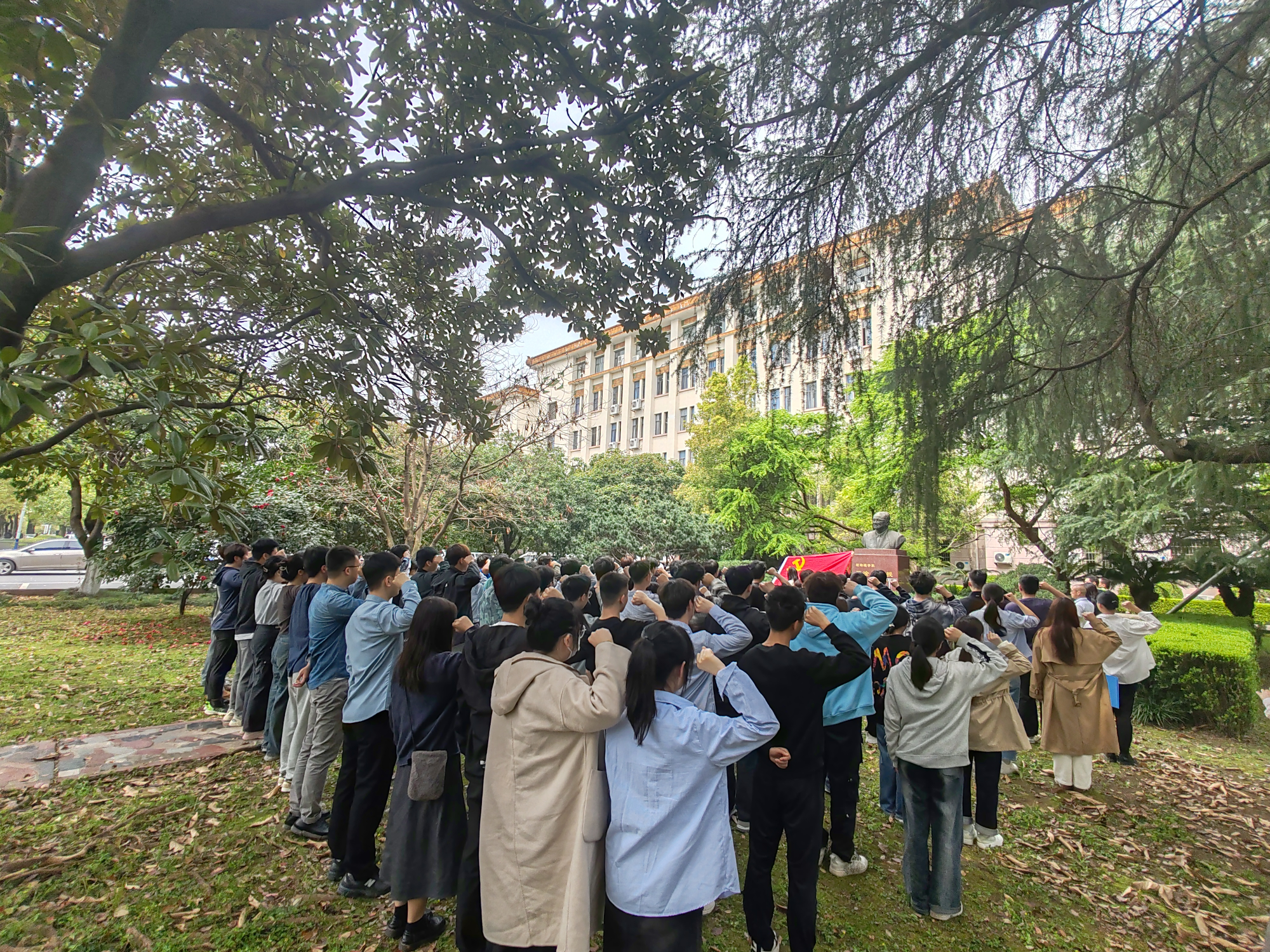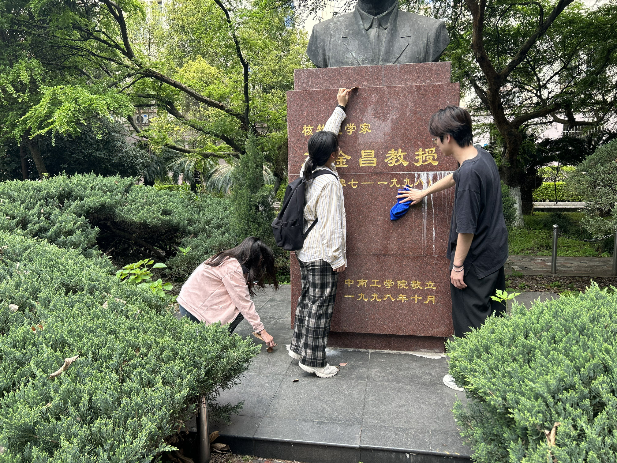 活动结束后,全体新党员清洗了王淦昌先生的铜像。同学们非常认真的擦拭了王淦昌前辈的铜像,清扫了铜像台子和周边的落叶。同学们以自己的方式向王淦昌前辈表达了诚挚的敬意。