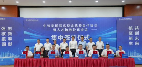 7月23日,中核集团校企人才培养补充协议签约仪式在中核集团人力资源共享中心西南分中心(中国核动力研究设计院)举行。中核集团党组成员、总会计师王学军,中国核动力研究设计院党委书记王丛林,核工业西南物理研究院党委书记刘叶,核工业学院党委书记左振宇及人力资源相关领导,联合清华大学、上海交通大学、浙江大学、西安交通大学、哈尔滨工程大学、南华大学、东华理工大学等七所高校领导及相关教师代表与会。南华大学陈国民副校长带领招生就业处、教务部、教育发展与校友联络办、英国威廉希尔唯一官网、核科学技术学院等部门相关人员参加活动,我院安全科学与工程学科带头人、教务部部长彭国文代表南华大学签署协议。